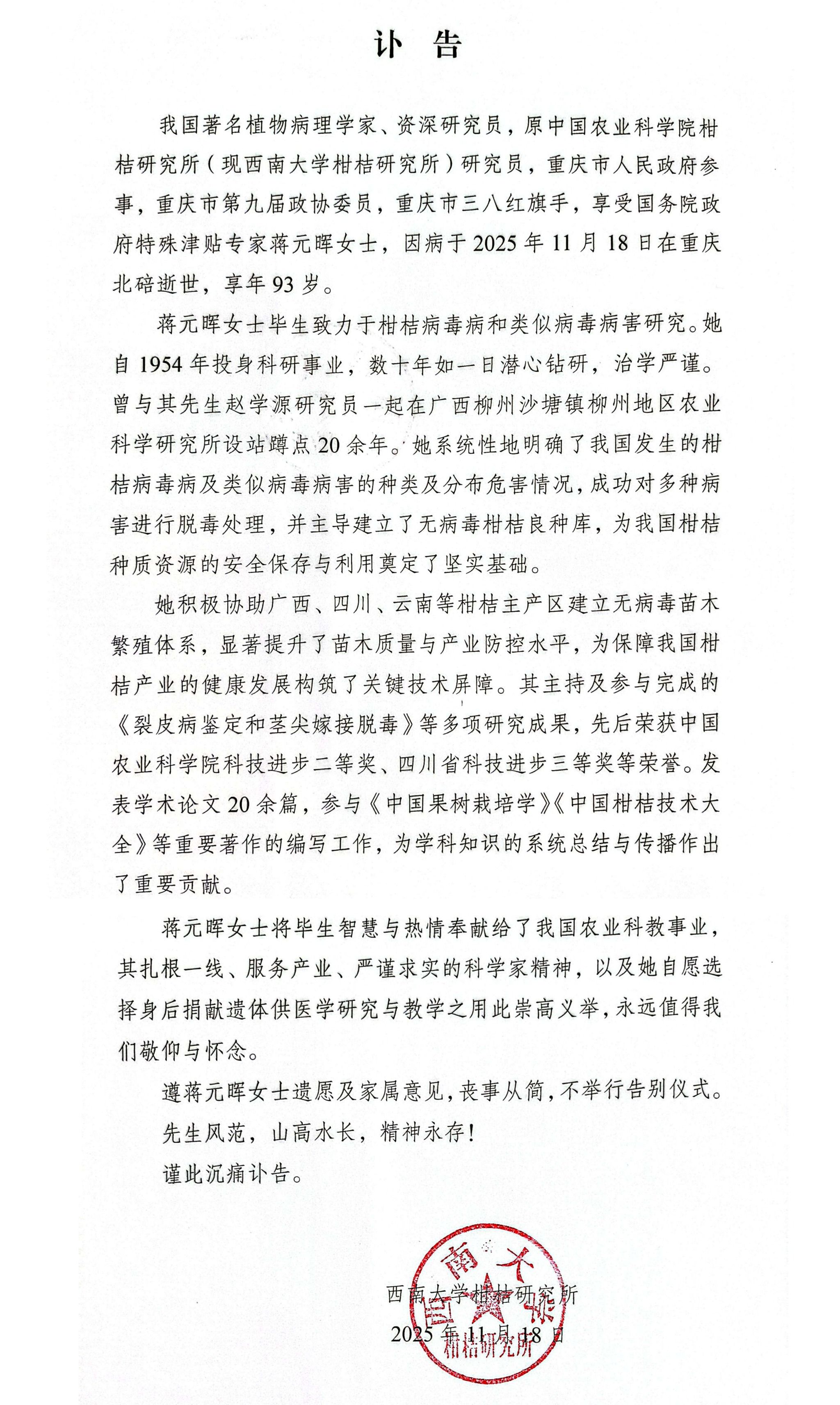 11月18日,西南大學柑桔研究所發(fā)布訃告:我國著名植物病理學家、資深研究員,原中國農(nóng)業(yè)科學院柑桔研究所(現(xiàn)西南大學柑桔研究所)研究員,重慶市人民政府參事,重慶市第九屆政協(xié)委員,重慶市三八紅旗手,享受國務院政府特殊津貼專家蔣元暉女士,因病于2025年11月18日在重慶北碚逝世,享年93歲。