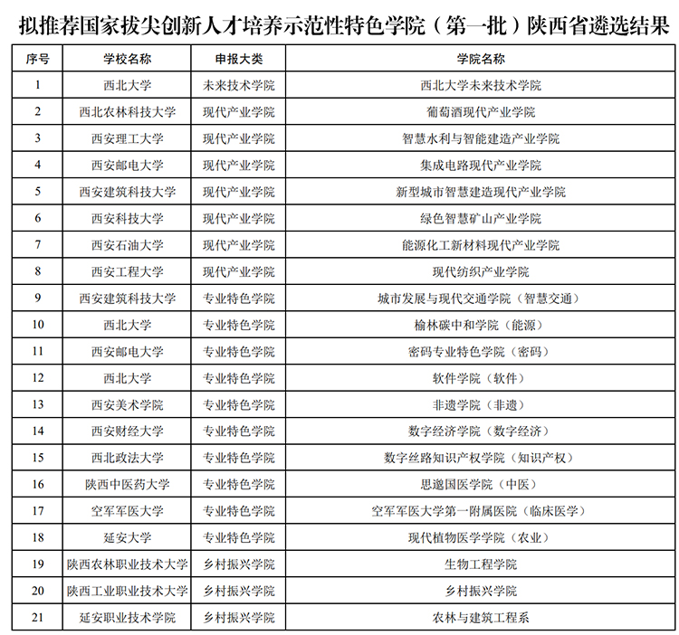 根據(jù)國家拔尖創(chuàng)新人才培養(yǎng)示范性特色學(xué)院遴選推薦工作安排,經(jīng)省級評議,擬推薦西北大學(xué)未來技術(shù)學(xué)院1個未來技術(shù)學(xué)院、西北農(nóng)林科技大學(xué)葡萄酒現(xiàn)代產(chǎn)業(yè)學(xué)院等7個現(xiàn)代產(chǎn)業(yè)學(xué)院、西安建筑科技大學(xué)城市發(fā)展與現(xiàn)代交通學(xué)院等10個專業(yè)特色學(xué)院、陜西農(nóng)林職業(yè)技術(shù)大學(xué)生物工程學(xué)院等3個鄉(xiāng)村振興學(xué)院參加教育部評選。