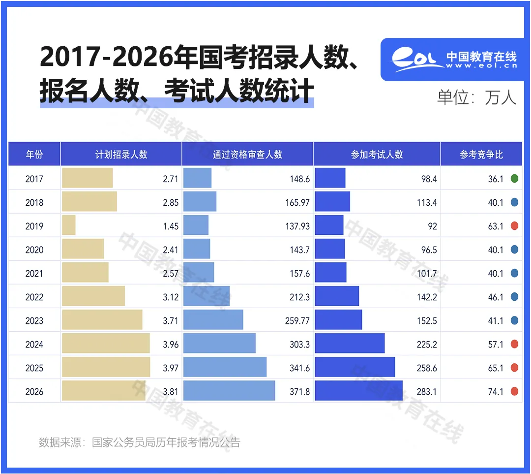 11月30日,2026年公務(wù)員國(guó)考開(kāi)考,通過(guò)資格審查的報(bào)名人數(shù)371.8萬(wàn)人(實(shí)際參考人數(shù)為283.1萬(wàn)人),共計(jì)劃招錄3.81萬(wàn)人,比去年減少0.16萬(wàn)人,錄取比74:1,比去年的65:1有明顯增長(zhǎng)。