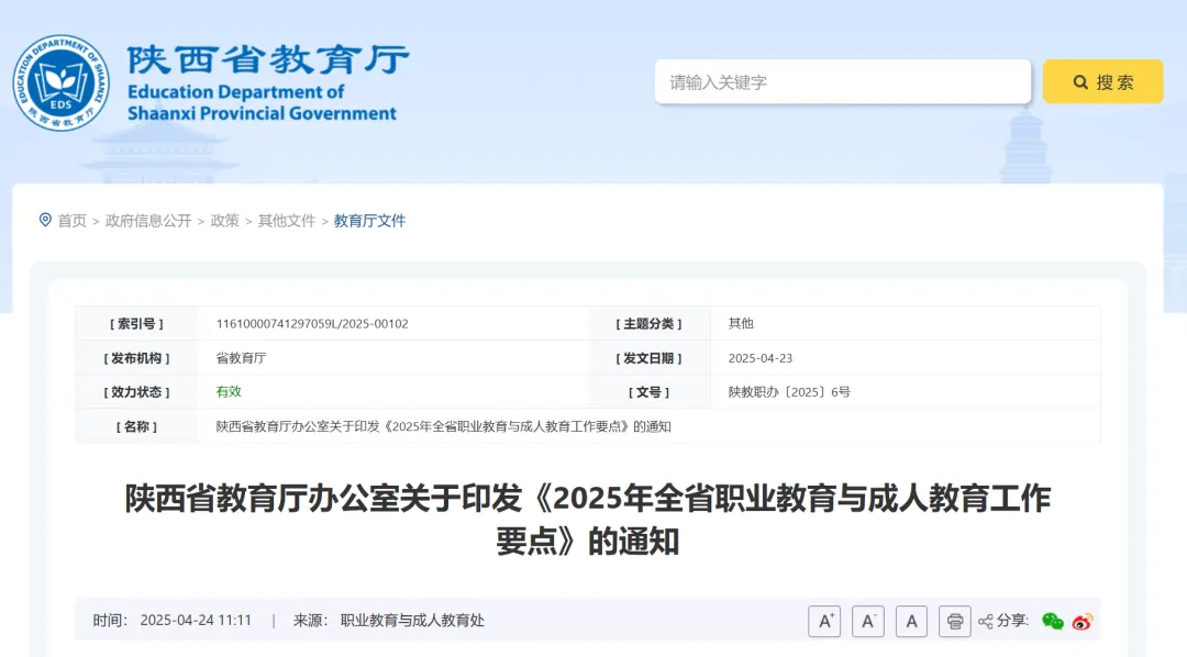 近日,陜西省教育廳印發(fā)《2025年全省職業(yè)教育與成人教育工作要點》。要點明確,優(yōu)化專業(yè)設(shè)置方面,將優(yōu)先設(shè)置急需專業(yè),全面清理停辦專業(yè)。推進(jìn)職普教育學(xué)籍互轉(zhuǎn)、課程互選、學(xué)分互認(rèn)等。面向中亞地區(qū)建設(shè)一批“秦嶺工坊”,打造陜西“職教出海”國際品牌。