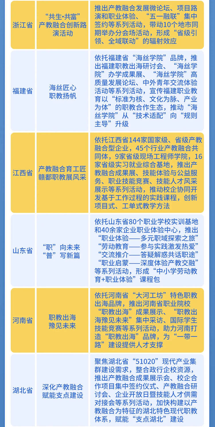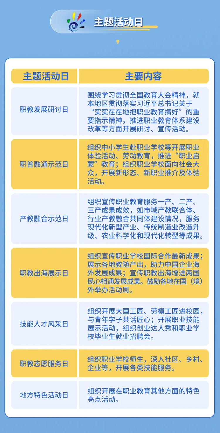 《通知》指出,今年活動(dòng)周首次推出“主題活動(dòng)日”,分別是:“職教發(fā)展研討日”“職普融通示范日”“產(chǎn)教融合示范日”“職教出海展示日”“技能人才風(fēng)采日”“職教志愿服務(wù)日”以及“地方特色活動(dòng)日”,推動(dòng)各地各部門(mén)用好活動(dòng)周時(shí)長(zhǎng),合理安排不同宣傳主題,確?;顒?dòng)周期間天天有活動(dòng)、精彩不斷線。