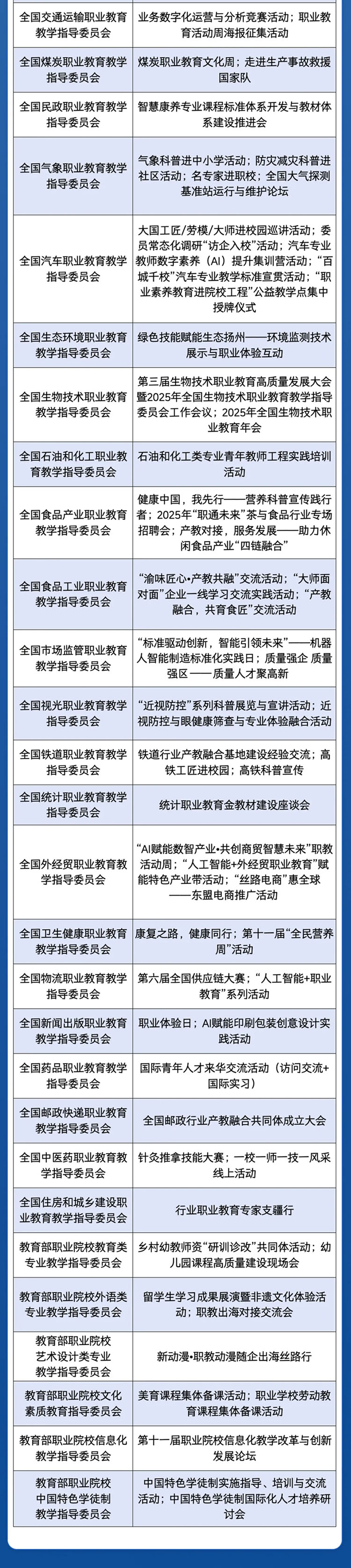 在全國(guó)性活動(dòng)方面,教育部等九部門(mén)分別在本系統(tǒng)內(nèi)牽頭組織開(kāi)展“職業(yè)教育大講堂”、“技能照亮前程”培訓(xùn)行動(dòng)宣傳、“職業(yè)教育賦能中小企業(yè)數(shù)字化轉(zhuǎn)型”對(duì)接、全國(guó)職業(yè)院校智慧農(nóng)業(yè)技能大賽、“大國(guó)工匠進(jìn)校園”、“中國(guó)工人大思政課”走進(jìn)職業(yè)院校、“匠心筑夢(mèng) 職啟未來(lái)”主題團(tuán)日、全國(guó)“雨露計(jì)劃”職業(yè)發(fā)展聯(lián)盟成立大會(huì)等14項(xiàng)全國(guó)性活動(dòng)。此外,教育部組織43個(gè)全國(guó)行業(yè)職業(yè)教育教學(xué)指導(dǎo)委員會(huì)精心設(shè)計(jì)了80余項(xiàng)各行業(yè)全國(guó)性特色活動(dòng)。