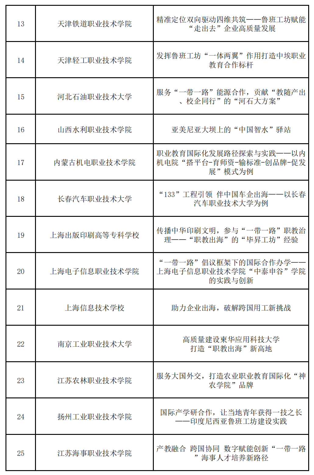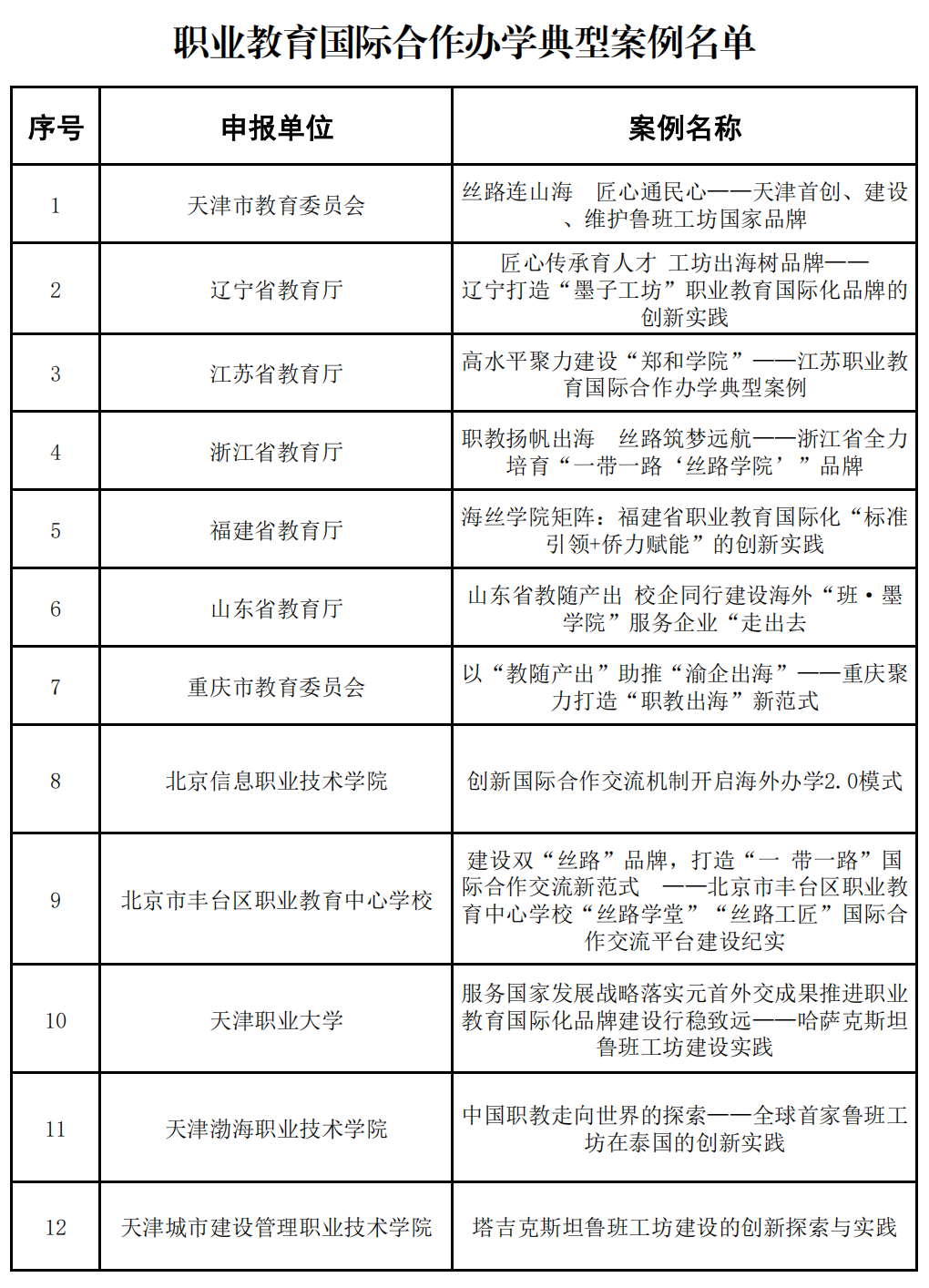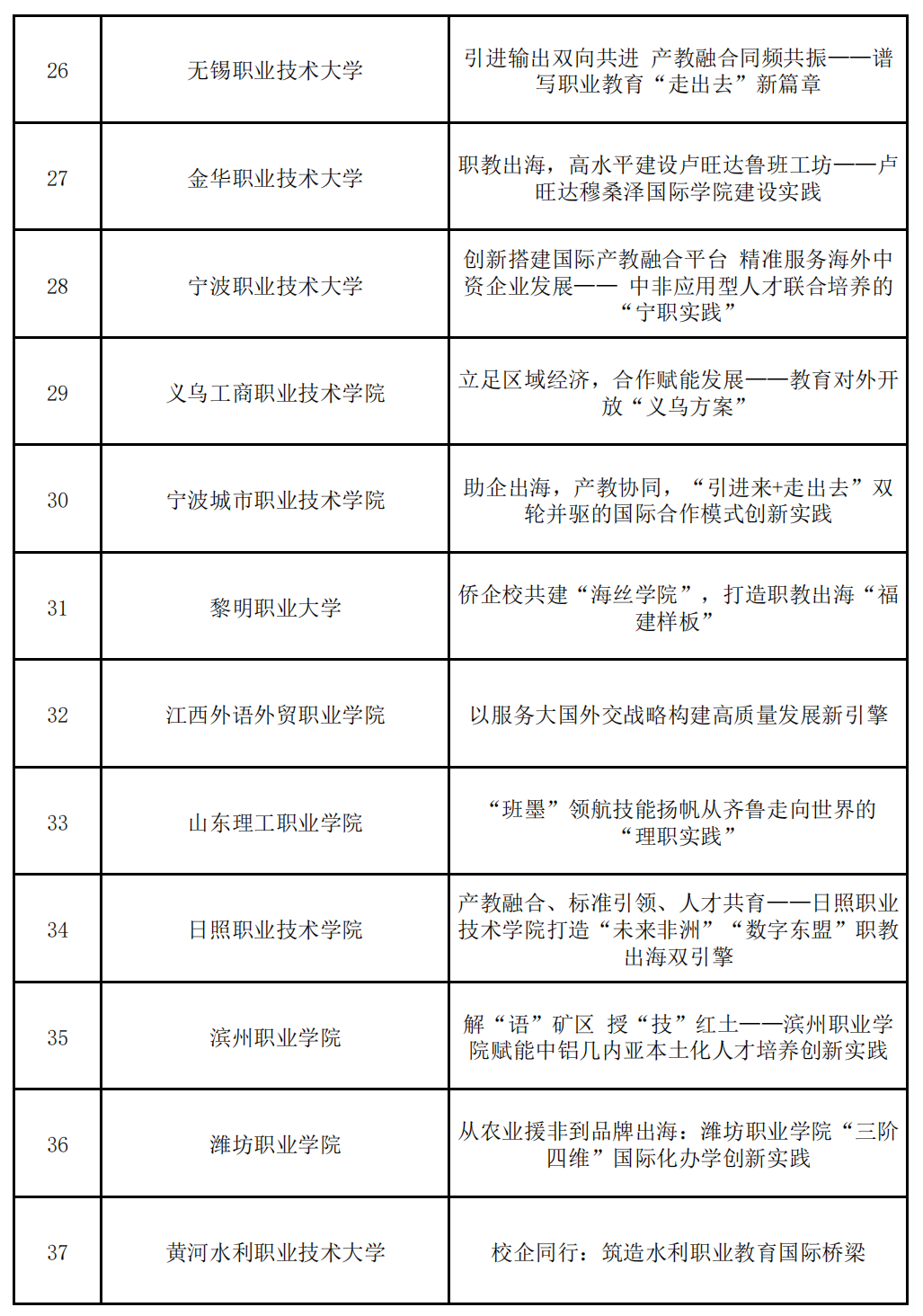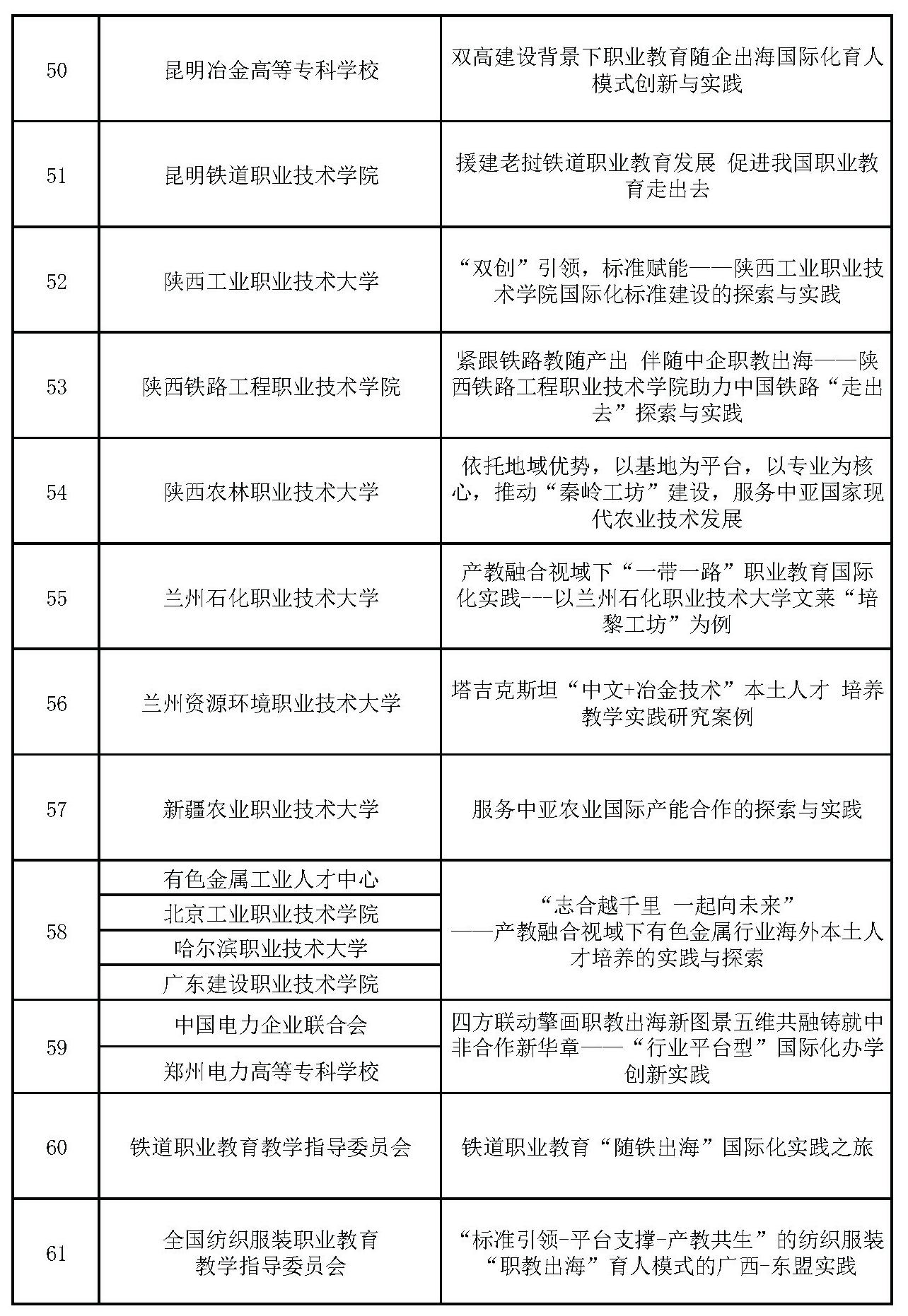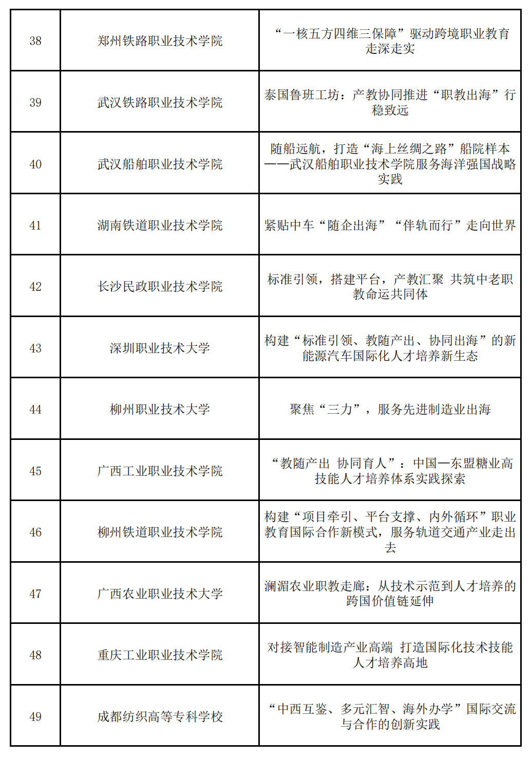 9月24日,中國(guó)教育國(guó)際交流協(xié)會(huì)發(fā)布《關(guān)于公布職業(yè)教育國(guó)際合作辦學(xué)典型案例名單的通知》,受教育部職業(yè)教育與成人教育司委托,中國(guó)教育國(guó)際交流協(xié)會(huì)開展職業(yè)教育國(guó)際合作辦學(xué)典型案例推介工作?,F(xiàn)將征集和遴選產(chǎn)生的61個(gè)優(yōu)秀案例予以公布。根據(jù)名單,全國(guó)共有52所高職院校入選。