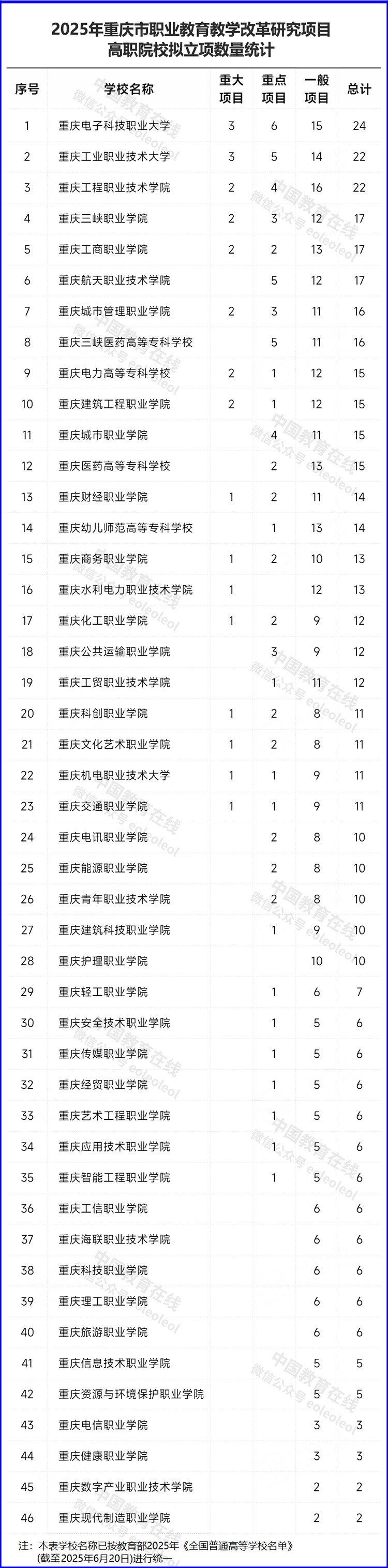 10月27日,重慶市教育委員會發(fā)布《2025年重慶市職業(yè)教育教學改革研究項目擬立項名單公示》。根據相關文件要求,經個人申報、學校推薦、專家評審推薦,2025年度擬立項職業(yè)教育教學改革研究項目652項,其中重大項目38項、重點項目93項、一般項目521項。