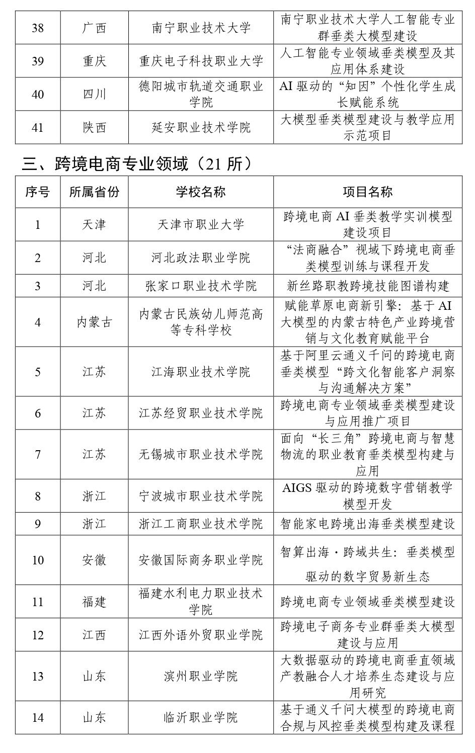 12月17日,教育部職業(yè)教育發(fā)展中心公布職業(yè)教育專業(yè)領(lǐng)域垂類模型建設(shè)項目(第三批)入選名單。此次共遴選出77所院校參與相關(guān)項目建設(shè)(其中,云計算專業(yè)領(lǐng)域15所、人工智能專業(yè)領(lǐng)域41所,跨境電商專業(yè)領(lǐng)域21所)。