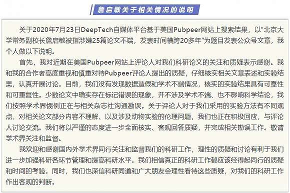近日,詹啟敏院士在其個(gè)人微信公眾號(hào)進(jìn)行回應(yīng),表示:“目前,我們沒(méi)有發(fā)現(xiàn)數(shù)據(jù)造假和學(xué)術(shù)不端情況,核實(shí)的實(shí)驗(yàn)結(jié)果具有可靠性和可重復(fù)性。少數(shù)論文中確實(shí)存在標(biāo)記錯(cuò)誤的現(xiàn)象,并不涉及學(xué)術(shù)不端、也不影響科學(xué)結(jié)論,我們按照學(xué)術(shù)界慣例正在與相關(guān)雜志社溝通勘誤?!?/p>