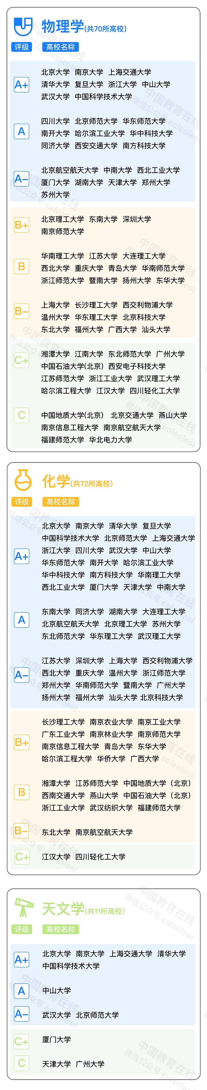 中國大陸有5所高校的天文學評級達到A+,分別為北京大學、南京大學、上海交通大學、清華大學和中國科學技術(shù)大學。總體而言,有21所中國大陸高校在至少一門理學學科中獲得A+評級。