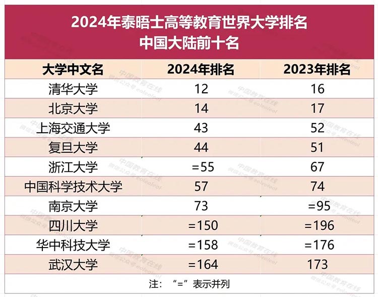 本屆排名,中國大陸有兩所大學(xué)進(jìn)入前20名,7所大學(xué)進(jìn)入前100名,13所大學(xué)進(jìn)入前200名。在六年前發(fā)布的2018年世界大學(xué)排名中,中國大陸僅有兩所大學(xué)進(jìn)入前100名。在過去的五年中,中國大陸高校在世界范圍內(nèi)進(jìn)步最大,總平均分從2020年的35.5分上升到2024年的48.9分。