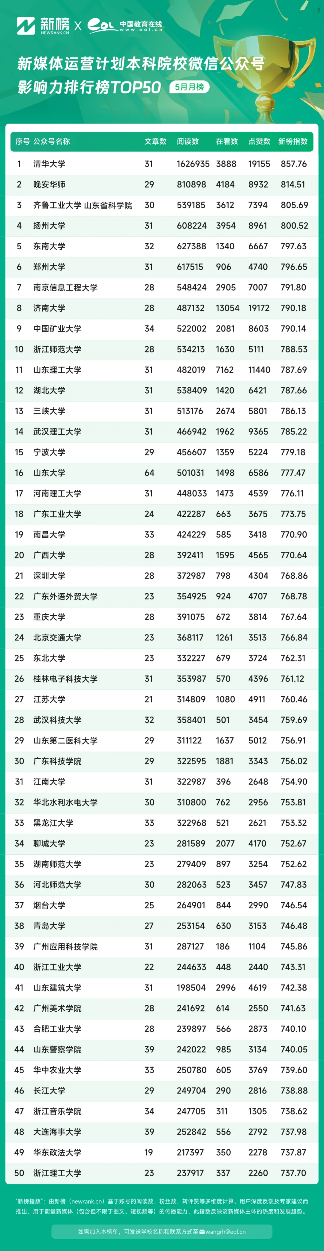 5月,中國教育在線新媒體運(yùn)營計(jì)劃本科院校微信公眾號影響力排行榜TOP50中,@清華大學(xué)公眾號憑借857.76的新榜指數(shù)躍居榜單第一,@晚安華師憑借814.51的影響力指數(shù)位居第二,@齊魯工業(yè)大學(xué)以805.69的影響力指數(shù)位居榜單第三。