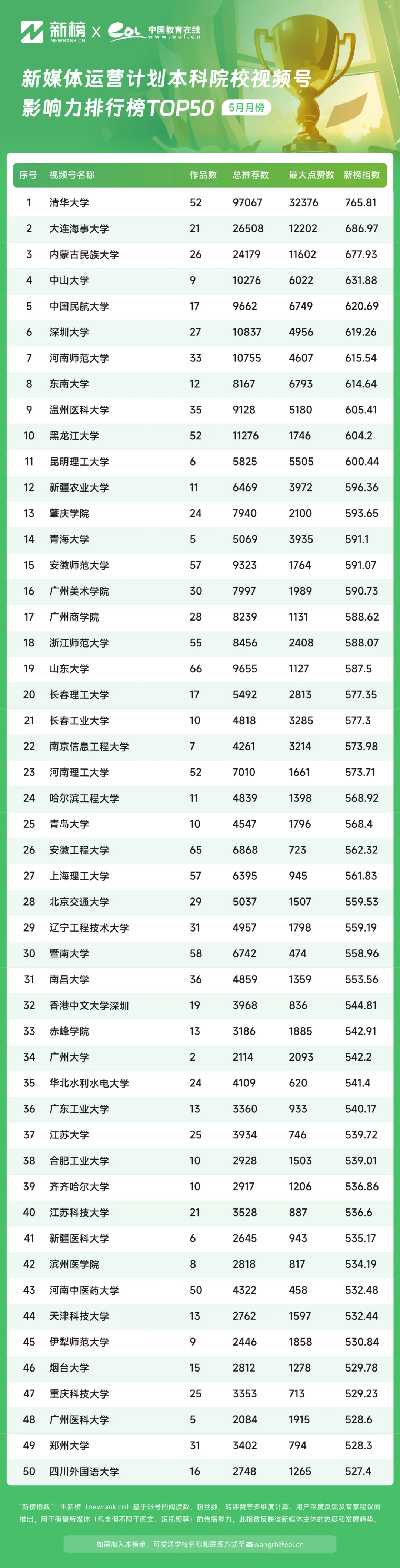 5月,中國教育在線新媒體運(yùn)營計(jì)劃本科院校微信視頻號影響力排行榜TOP50中,@清華大學(xué)視頻號憑借765.81的新榜指數(shù)躍居榜單第一,@大連海事大學(xué)憑借686.97的影響力指數(shù)位居第二,@內(nèi)蒙古民族大學(xué)以677.93的影響力指數(shù)位居榜單第三。