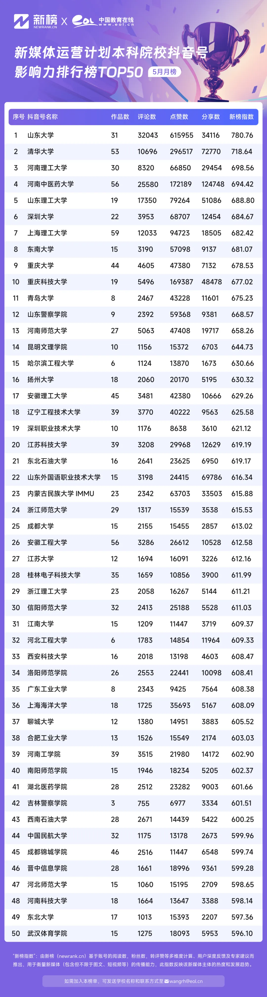 5月,中國教育在線新媒體運(yùn)營計(jì)劃本科院校微信抖音號影響力排行榜TOP50中,@山東大學(xué)抖音號憑借780.76的新榜指數(shù)躍居榜單第一,@清華大學(xué)憑借718.64的影響力指數(shù)位居第二,@河南理工大學(xué)以698.56的影響力指數(shù)位居榜單第三。