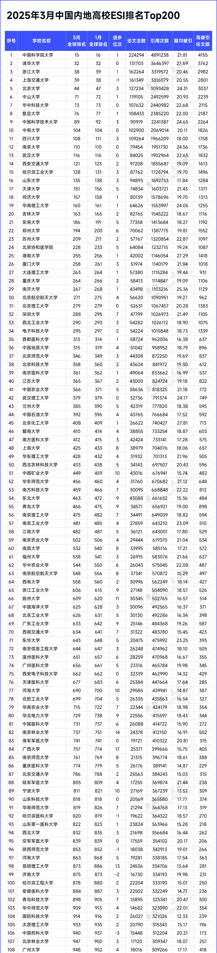 3月13日,科睿唯安(Clarivate Analytics)公布了2025年3月的ESI最新數(shù)據(jù)。ESI(基本科學(xué)指標(biāo)數(shù)據(jù)庫(kù))是目前世界范圍內(nèi)普遍用以評(píng)價(jià)高校、學(xué)術(shù)機(jī)構(gòu)、國(guó)家或地區(qū)國(guó)際學(xué)術(shù)水平及影響力的重要評(píng)價(jià)指標(biāo)工具之一。本次數(shù)據(jù)覆蓋時(shí)間范圍為2014年1月到2024年12月。