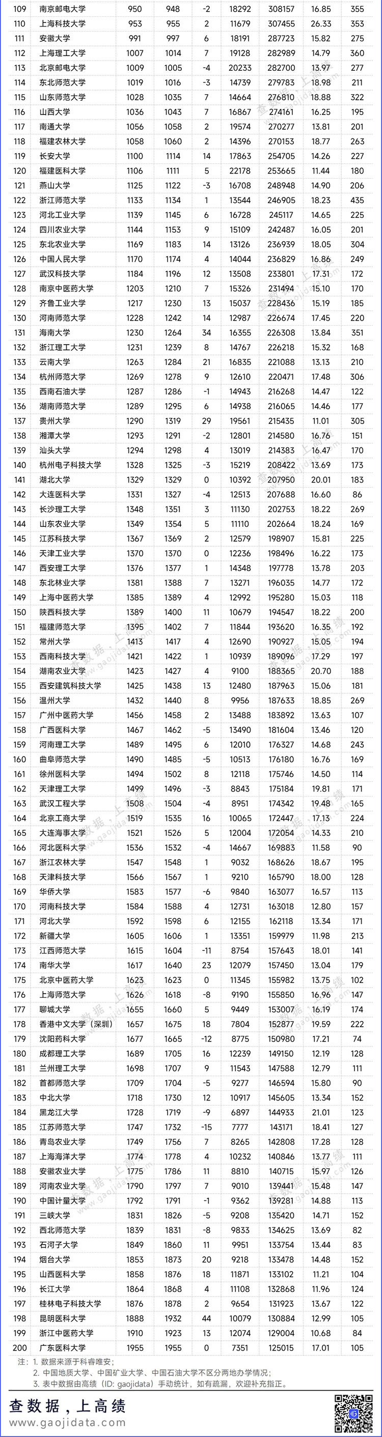 國(guó)際排名前200的高校還有中山大學(xué)、華中科技大學(xué)、復(fù)旦大學(xué)、中國(guó)科學(xué)技術(shù)大學(xué)、中南大學(xué)、四川大學(xué)、南京大學(xué)、武漢大學(xué)、西安交通大學(xué)、哈爾濱工業(yè)大學(xué)、山東大學(xué)、天津大學(xué)、同濟(jì)大學(xué)、華南理工大學(xué)、吉林大學(xué)、東南大學(xué)和鄭州大學(xué)。