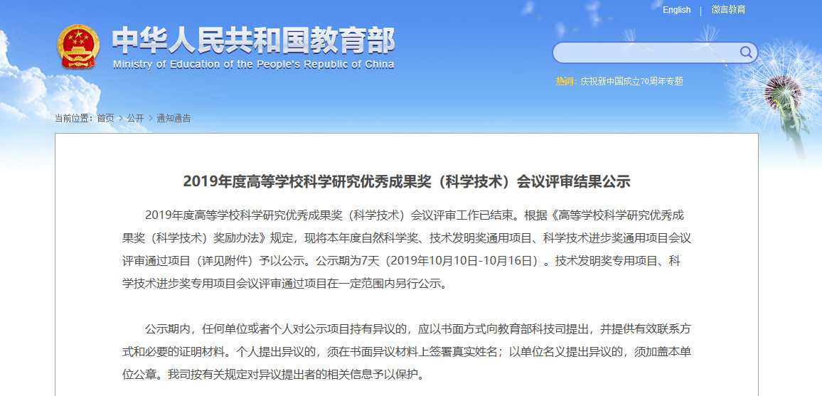 10月10日,教育部科技司正式對(duì)外公示2019年度高等學(xué)??茖W(xué)研究優(yōu)秀成果獎(jiǎng)(科學(xué)技術(shù))(以下簡稱“優(yōu)秀成果獎(jiǎng)”)會(huì)議評(píng)審結(jié)果。本次評(píng)審出的自然科學(xué)獎(jiǎng)121個(gè)、技術(shù)發(fā)明獎(jiǎng)通用項(xiàng)目45個(gè)、科學(xué)技術(shù)進(jìn)步獎(jiǎng)通用項(xiàng)目129個(gè),共計(jì)295個(gè)獎(jiǎng)項(xiàng)。