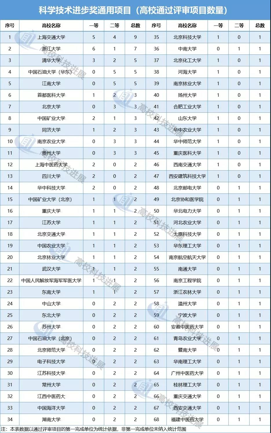 從科學(xué)技術(shù)進(jìn)步獎(jiǎng)通用項(xiàng)目的會(huì)議評(píng)審結(jié)果來看,共有68所高校推薦項(xiàng)目通過評(píng)審,獲通過項(xiàng)目的高校數(shù)量與自然科學(xué)獎(jiǎng)相差無幾。
