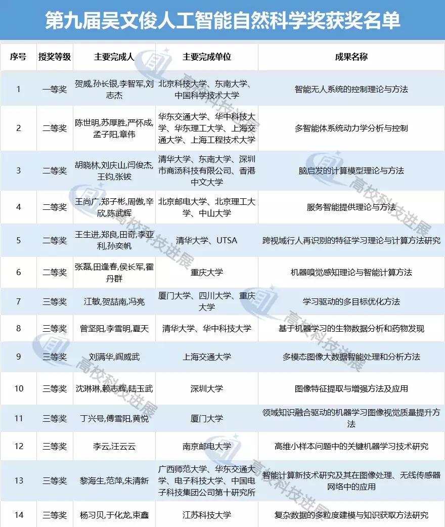 從“吳文俊人工智能自然科學(xué)獎(jiǎng)”獲獎(jiǎng)情況來看,北京科技大學(xué)賀威作為第一完成人完成的項(xiàng)目成果獲得一等獎(jiǎng);清華大學(xué)胡曉林、華東交通大學(xué)陳世明、北京郵電大學(xué)王尚廣、清華大學(xué)王生進(jìn)、重慶大學(xué)張磊等第一完成人完成的項(xiàng)目成果分別獲得二等獎(jiǎng);廈門大學(xué)江敏、清華大學(xué)曾堅(jiān)陽、上海交通大學(xué)劉滿華、深圳大學(xué)沈琳琳、廈門大學(xué)丁興號(hào)、南京郵電大學(xué)李云、廣西師范大學(xué)黎海生、江蘇科技大學(xué)楊習(xí)貝等第一完成人完成的項(xiàng)目成果分別獲得三等獎(jiǎng)。獲獎(jiǎng)項(xiàng)目數(shù)量共計(jì)14個(gè),占該獎(jiǎng)項(xiàng)獲獎(jiǎng)總數(shù)的比例高達(dá)93.3%。