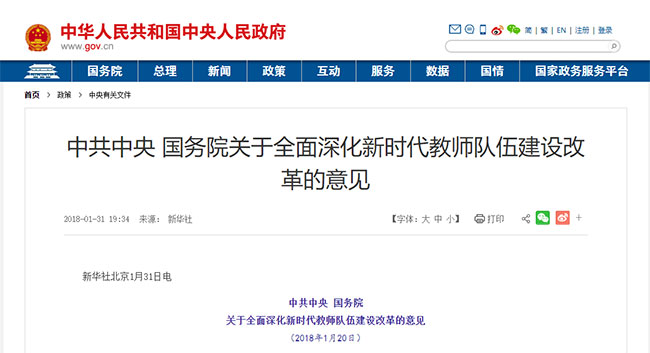 2018年1月20日,中共中央、國務(wù)院印發(fā)《關(guān)于全面深化新時代教師隊伍建設(shè)改革的意見》,提出要“不斷提高地位待遇,真正讓教師成為令人羨慕的職業(yè)”。