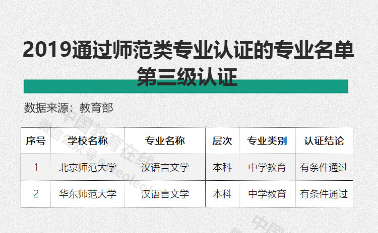 教育部公布的2019年通過普通高等學(xué)校師范類專業(yè)認證的專業(yè)名單中,北京師范大學(xué)及華東師范大學(xué)的漢語言文學(xué)專業(yè)分別通過第三級專業(yè)認證。(備注:通過第三級認證的專業(yè),在認證結(jié)論有效期內(nèi)入學(xué)的師范生,可由高校自行組織中小學(xué)教師資格考試筆試和面試工作。)