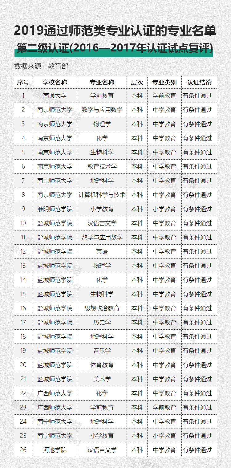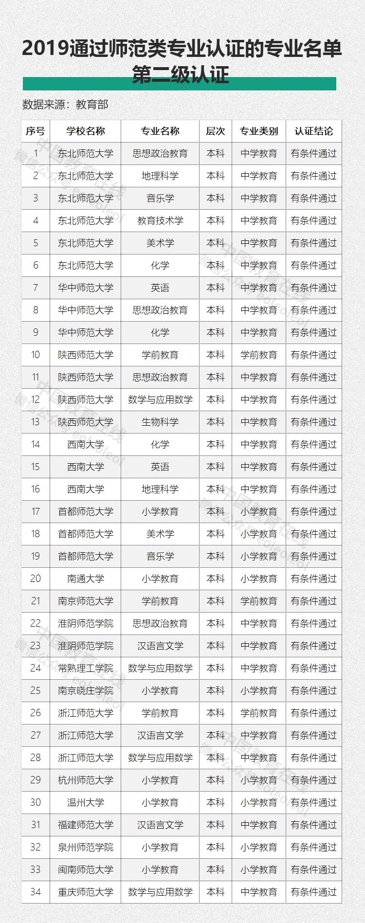 東北師范大學(xué)、華中師范大學(xué)等17所高校的34個專業(yè)通過第二級專業(yè)認證。(備注:通過第二級認證的專業(yè),在認證結(jié)論有效期內(nèi)入學(xué)的師范生,可由高校自行組織中小學(xué)教師資格考試面試工作。)