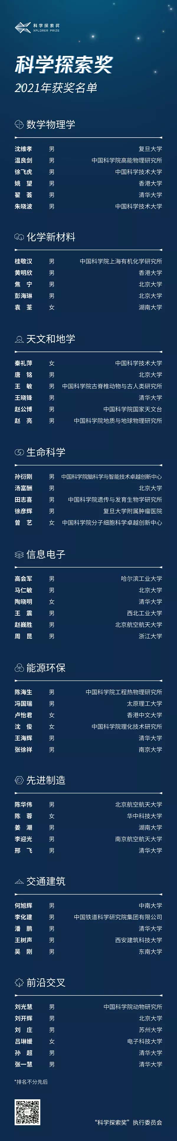據(jù)介紹,“科學探索獎”是由騰訊基金會出資支持、科學家主導的公益性獎項,是目前國內(nèi)金額最高的青年科技人才資助計劃之一。該獎項聚焦數(shù)學物理學、生命科學、天文和地學、化學新材料、信息電子、能源環(huán)保、先進制造、交通建筑、前沿交叉等9個領(lǐng)域,支持在中國內(nèi)地及港澳地區(qū)全職工作、45周歲及以下的青年科技工作者。