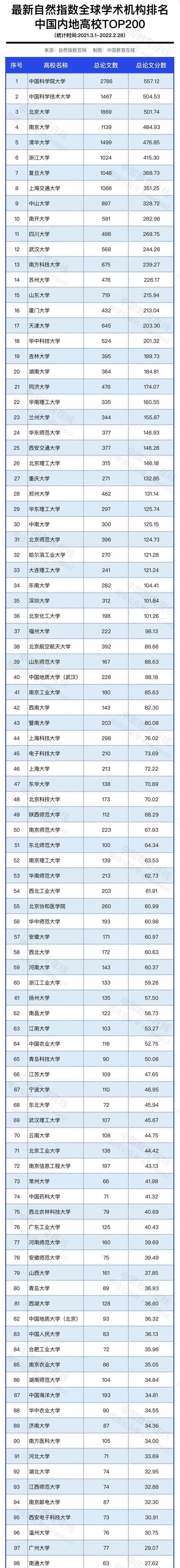 最新自然指數(shù)排名中國(guó)內(nèi)地高校排名情況如下: