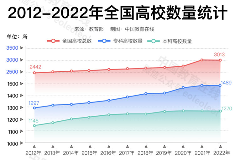 根據(jù)教育部發(fā)布《全國高等學校名單》,截至2022年5月31日,全國高等學校共計3013所,相較2012年的2442所,增加了571所,高校數(shù)量逐年平穩(wěn)增長。