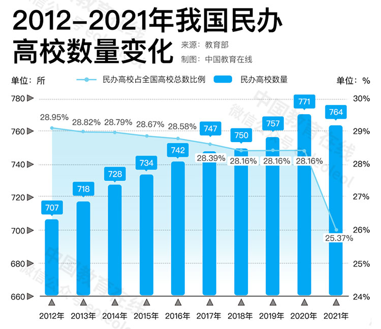 十年來,民辦高校在全國高校中的占比逐漸下降。