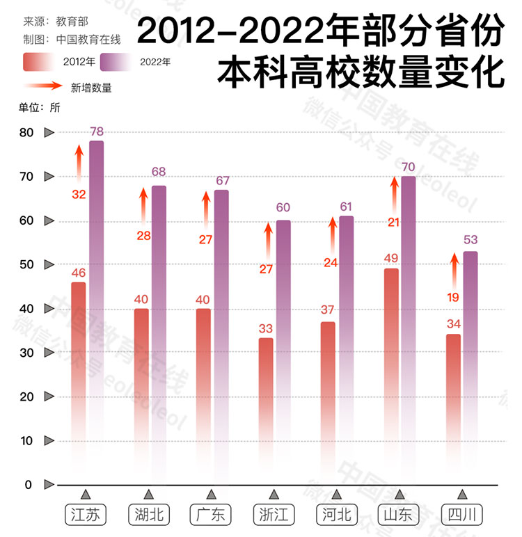 除四川外,新增高校數(shù)量最多的省份分別是廣東(40所)、江蘇(39所)、河南(36所)、以及湖北(34所)。貴州省的高校數(shù)量增長幅度最大,2022年(75所)與十年前相比增加了31所,漲幅為70%。