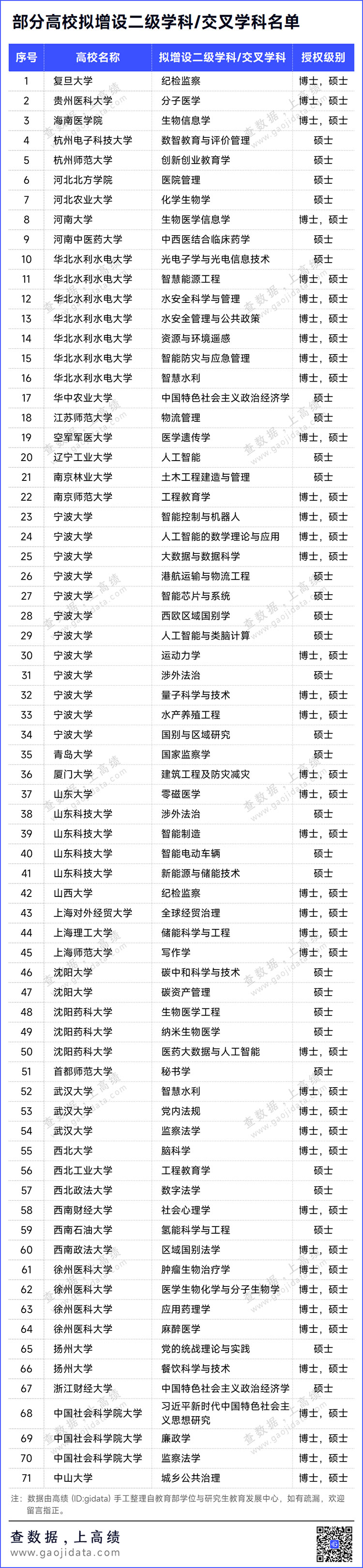 經(jīng)高績(jī)(ID:gjdata)不完全統(tǒng)計(jì),目前已至少有40所高校擬增設(shè)二級(jí)學(xué)科或交叉學(xué)科,具體名單如下: