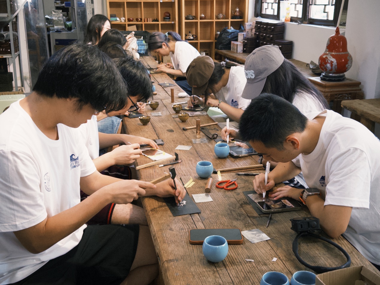 圖為隊員們在省級非遺-錫鑲工藝基地體驗鏨刻錫鑲紋樣,并將“精致城市”元素融入錫鑲設(shè)計,開發(fā)出系列文創(chuàng)產(chǎn)品。吳雅思 供圖