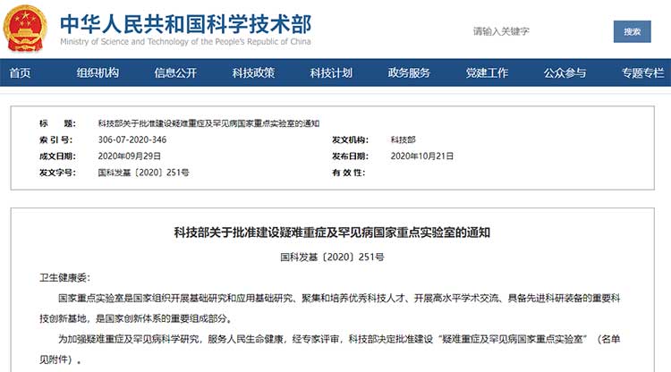 科技部關于批準建設疑難重癥及罕見病國家重點實驗室的通知