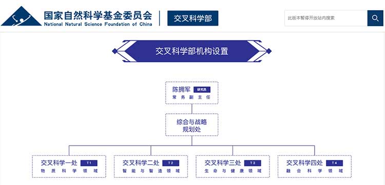 交叉科學(xué)部設(shè)有綜合與戰(zhàn)略規(guī)劃處以及四個科學(xué)處。