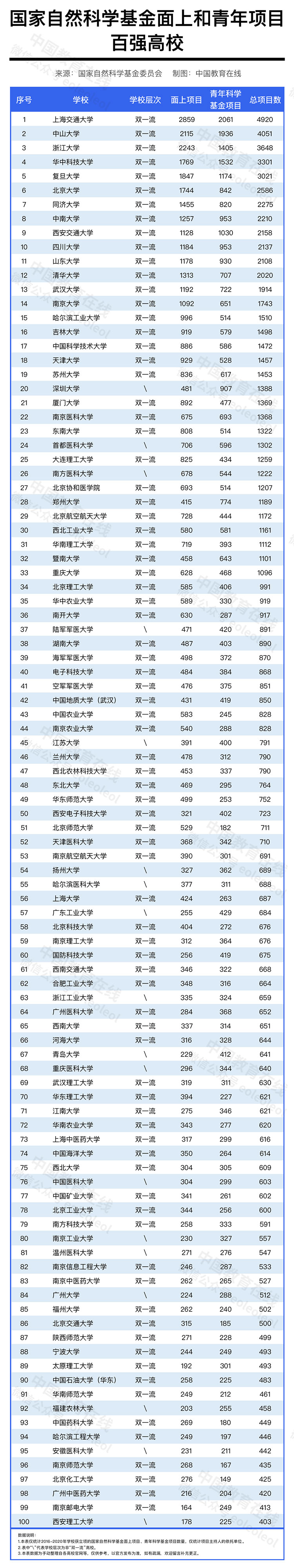 除重量級項目和人才項目之外,面上項目和一般青年科學(xué)基金項目也是國家自科基金的重要組成部分,是資助數(shù)量最多的兩個項目。本文對2016-2020年高校獲批國家自科基金面上和青年項目進(jìn)行了統(tǒng)計,包含國家自然科學(xué)基金面上項目和國家自然科學(xué)基金青年科學(xué)基金項目,僅統(tǒng)計項目主持人的依托單位。