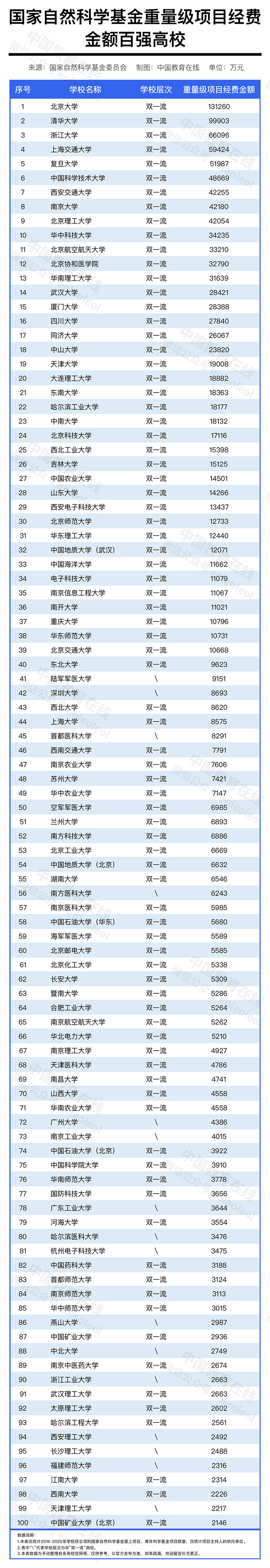 國家自科基金項目中的重量級項目在資助總經(jīng)費中占比最高,這些項目平均每項經(jīng)費超百萬,甚至有些項目獲批一個即可申請數(shù)千萬元經(jīng)費。重量級項目的獲批,展現(xiàn)了高校的頂尖科研實力。