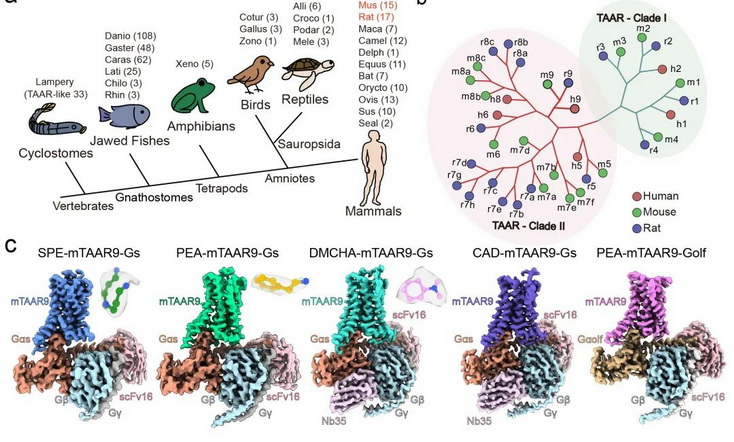 山東大學(xué)孫金鵬教授團(tuán)隊(duì)和上海交通大學(xué)醫(yī)學(xué)院李乾研究員團(tuán)隊(duì)合作,應(yīng)用冷凍電鏡技術(shù)解析了TAAR家族成員之一的小鼠TAAR9(mTAAR9)受體在4種不同配體結(jié)合條件下與Gs/Golf(嗅覺特異性Gα)蛋白三聚體復(fù)合物的結(jié)構(gòu),進(jìn)一步結(jié)合藥理學(xué)分析揭示了mTAAR9感知配體后被激活的分子機(jī)制。同時(shí),該研究也提出了嗅覺受體“組合編碼”識別配體的結(jié)構(gòu)機(jī)制,闡明了II類嗅覺受體獨(dú)特的激活方式。