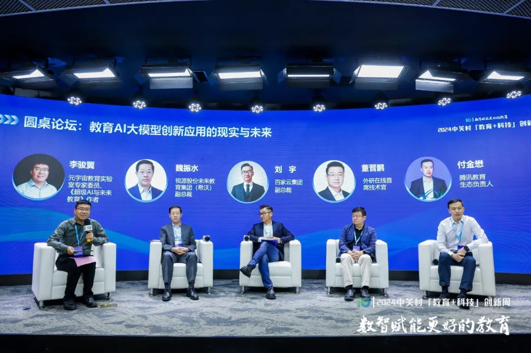 在“教育AI大模型創(chuàng)新應(yīng)用的現(xiàn)實(shí)與未來”圓桌論壇環(huán)節(jié),視源股份未來教育集團(tuán)(希沃)副總裁魏振水,百家云集團(tuán)副總裁劉宇,外研在線首席技術(shù)官董晉鵬,騰訊教育生態(tài)負(fù)責(zé)人付金懋分別就教育大模型的應(yīng)用、教育大模型的核心特點(diǎn)與未來發(fā)展趨勢、教育生態(tài)服務(wù)者的責(zé)任等一系列問題展開探討。在“百模大戰(zhàn)”的時代背景下,教育專屬大模型的應(yīng)用與實(shí)踐始終是行業(yè)關(guān)注的重點(diǎn)。面向未來,教育大模型應(yīng)進(jìn)一步保障數(shù)據(jù)的時效性、合規(guī)性和安全性,助力個性化學(xué)習(xí)和因材施教,促進(jìn)拔尖創(chuàng)新人才培養(yǎng)。教育科技產(chǎn)品的研發(fā)和應(yīng)用要緊跟國家政策引導(dǎo),政產(chǎn)學(xué)研用深度協(xié)同,推進(jìn)教育、科技、人才“三位一體”協(xié)同融合發(fā)展。元宇宙教育實(shí)驗(yàn)室專家委員,《超級AI與未來教育》作者李駿翼主持圓桌論壇。