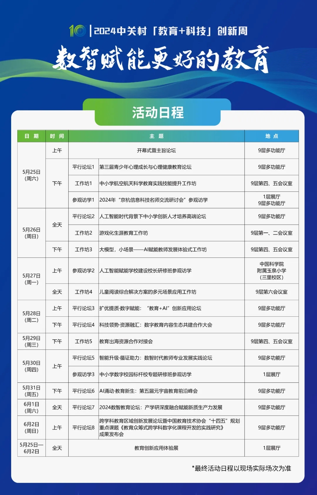 活動將從5月25日至6月2日持續(xù)舉辦,活動形式包括開幕式暨主旨論壇、平行論壇、教育工作坊、參觀訪學(xué)、教育創(chuàng)新應(yīng)用體驗(yàn)展等,內(nèi)容涵蓋人工智能教育應(yīng)用、學(xué)校育人模式創(chuàng)新、數(shù)字教育內(nèi)容建設(shè)、青少年心理健康、教師數(shù)字素養(yǎng)提升、產(chǎn)教融合發(fā)展等話題。