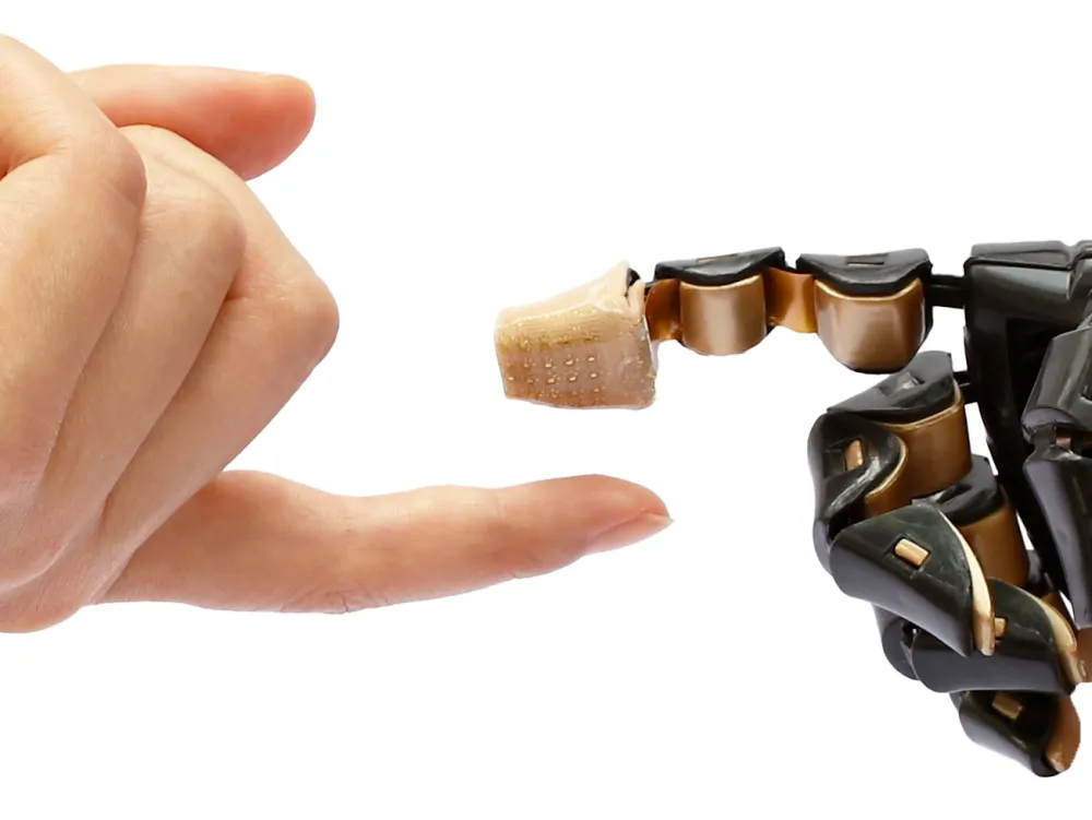圖為裝有仿生三維電子皮膚的機械手與人手互動。(受訪者供圖)
