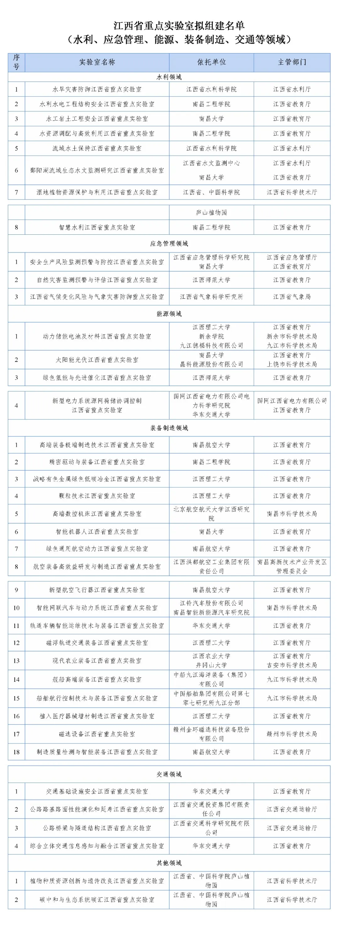江西省科技廳日前公示,經(jīng)組織申報(bào)、形式審查、專家評(píng)審、現(xiàn)場考察、會(huì)議審定等程序,擬批復(fù)組建依托“水旱災(zāi)害防御江西省重點(diǎn)實(shí)驗(yàn)室”等39個(gè)江西省重點(diǎn)實(shí)驗(yàn)室。此次批復(fù)組建的實(shí)驗(yàn)室主要分布在水利、應(yīng)急管理、能源、裝備制造、交通等領(lǐng)域,大部分依托南昌大學(xué)、江西師范大學(xué)、華東交通大學(xué)、江西理工大學(xué)、南昌航空大學(xué)、井岡山大學(xué)、南昌工程學(xué)院、新余學(xué)院等省內(nèi)高校。