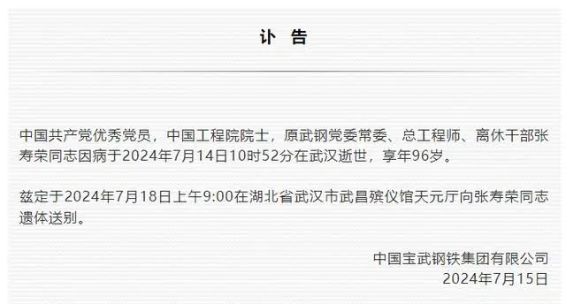 根據(jù)中國寶武鋼鐵集團(tuán)有限公司消息,中國共產(chǎn)黨優(yōu)秀黨員,中國工程院院士,原武鋼黨委常委、總工程師、離休干部張壽榮同志因病于2024年7月14日10時52分在武漢逝世,享年96歲。