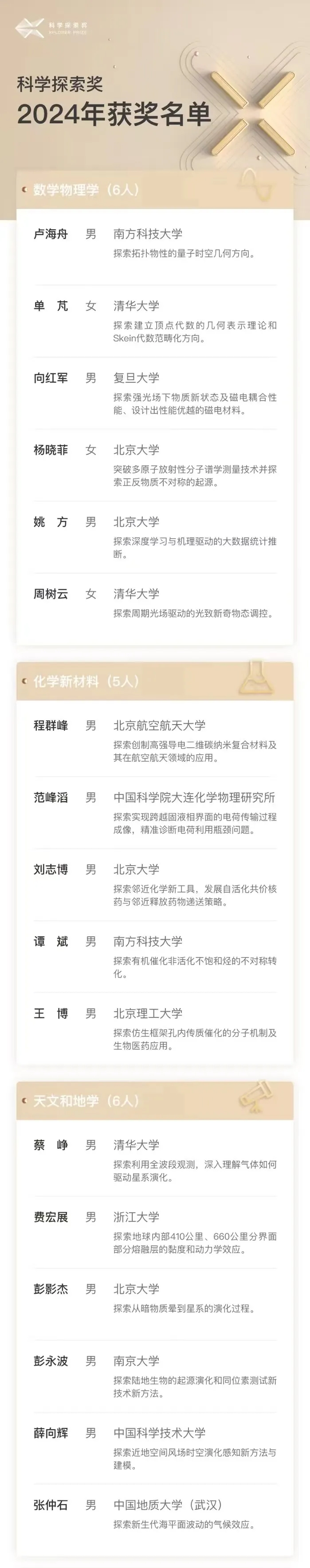 2024年“科學(xué)探索獎(jiǎng)”設(shè)置10個(gè)領(lǐng)域,包括數(shù)學(xué)物理學(xué)、化學(xué)新材料、天文和地學(xué)、生命科學(xué)、醫(yī)學(xué)科學(xué)、信息電子、能源環(huán)境、先進(jìn)制造、交通建筑、前沿交叉。每位獲獎(jiǎng)人在5年內(nèi)獲得總計(jì)300萬(wàn)元人民幣獎(jiǎng)金,且可自由支配。