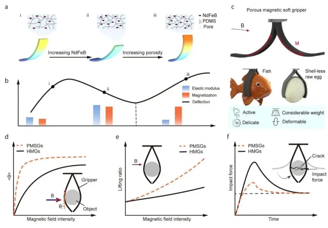 這種將多孔結構引入磁性硅膠彈性體制造抓手的方法,使抓手具備高磁化、低模量和粗糙表面的特點,使其在保持強大抓取力的同時,也能夠適應各種不同的場景,展現(xiàn)出柔軟與速度的完美平衡。