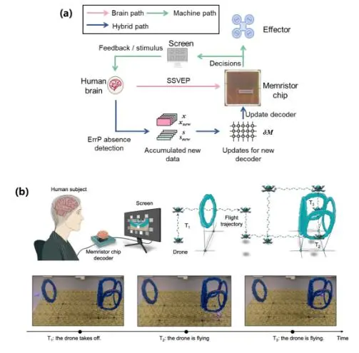 (a)腦-憶阻器交互式更新框架;(b)基于憶阻器腦電解碼的實時腦控?zé)o人機飛行。