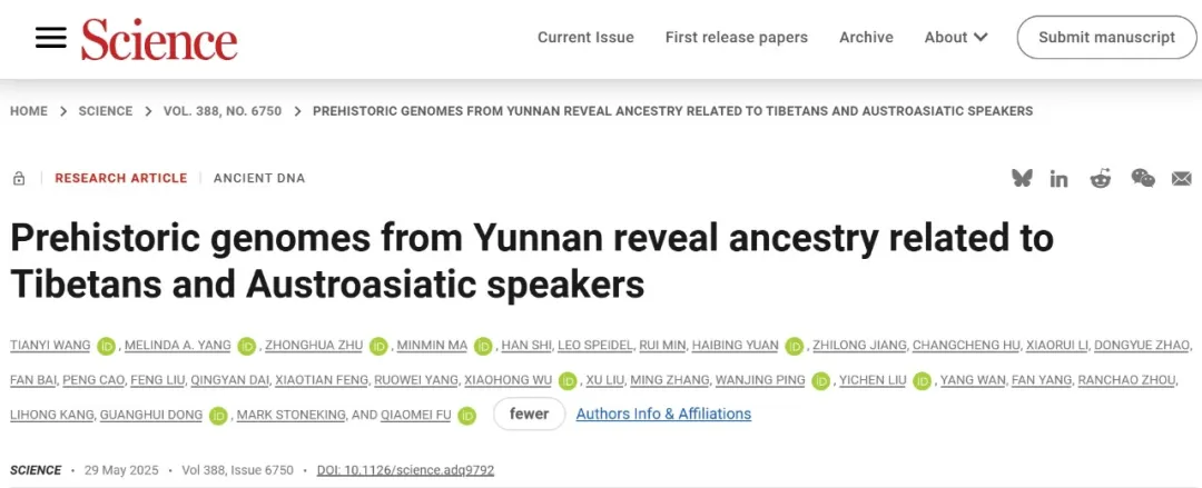 近日,四川大學考古文博學院、考古科學中心團隊與中國科學院古脊椎動物與古人類研究所付巧妹團隊等合作,系統(tǒng)研究了云南省17個遺址127例距今7100年以來的古人類基因組。該研究填補了該區(qū)域史前人群遺傳數(shù)據(jù)的空白,首次從遺傳學視角精準識別出青藏高原“幽靈祖先”成分,揭示出南亞語系人群遺傳起源及云南作為多元人群交流樞紐的關鍵作用。相關成果以“Prehistoric genomes from Yunnan reveal ancestry related to Tibetans and Austroasiatic speakers”為題發(fā)表在國際學術期刊《科學》(Science)。