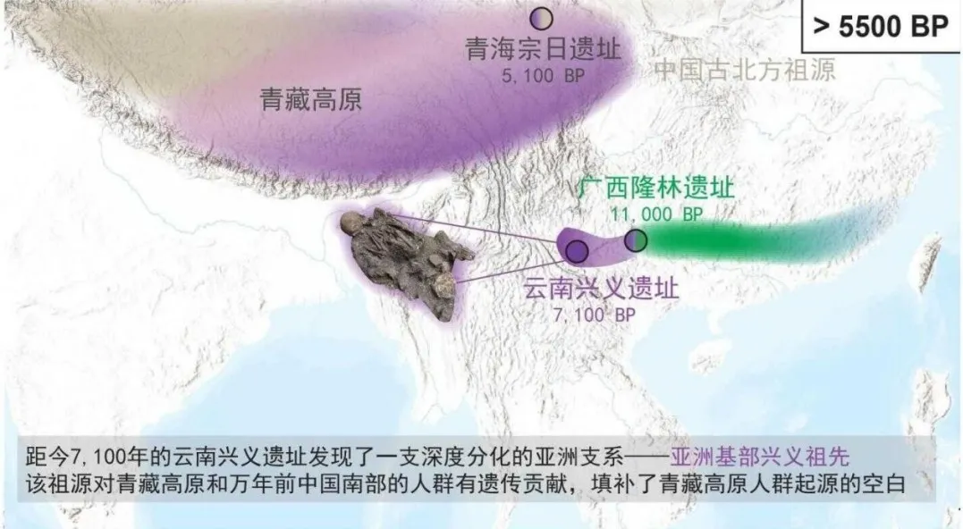 本研究的第一項突破是首次發(fā)現(xiàn)青藏高原“幽靈祖先”。青藏高原人群遺傳結構一直備受學界關注。根據(jù)此前研究成果,距今5100年前至今,青藏高原人群遺傳成分中約80%源自9500-4000年前的中國北方人群,其余20%來源不明,學界稱之為“幽靈祖先”。這一成分來源一直未能確定,備受學界關注。本研究通過基因捕獲、測序,從云南興義遺址一名距今7100年前的個體(Xingyi_EN)基因組中識別出一種新的、深度分化的亞洲遺傳成分,研究團隊判定其為“亞洲基部興義祖先”(Basal Asian Xingyi Ancestry)。研究表明,這一遺傳成分不僅對古代青藏高原人群有遺傳貢獻,也廣泛存在于現(xiàn)代藏族人群基因組中,以Xingyi_EN為代表的古老人群正是學界關注但之前尚未精準定位的青藏高原“幽靈祖先”組成成分之一,為東亞人群遷徙、演化過程提供了新證據(jù)。