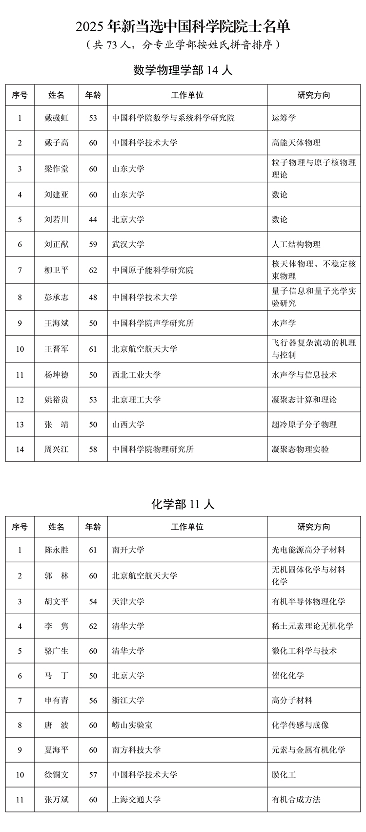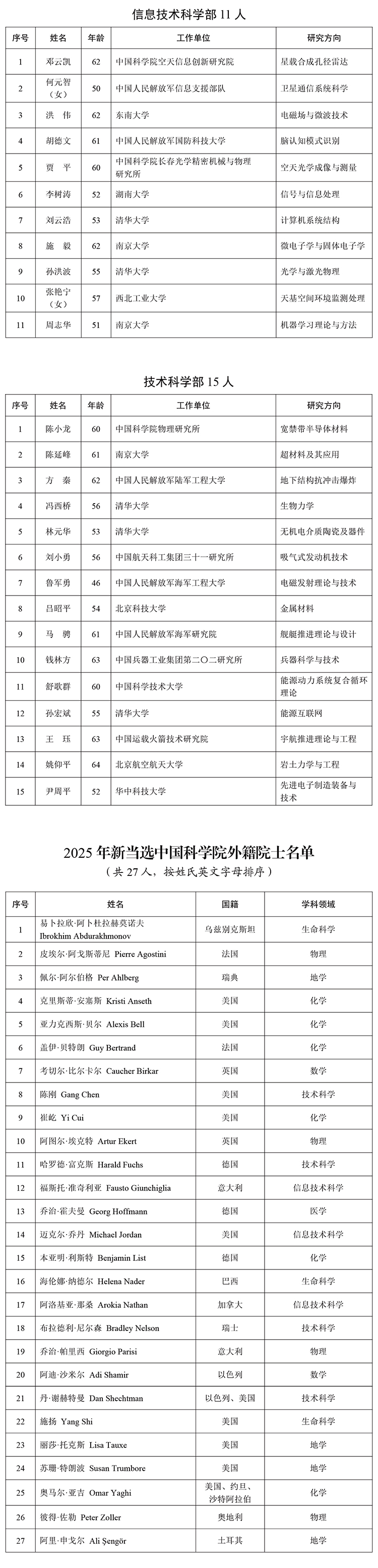 關于公布2025年中國科學院院士增選當選院士名單的公告
