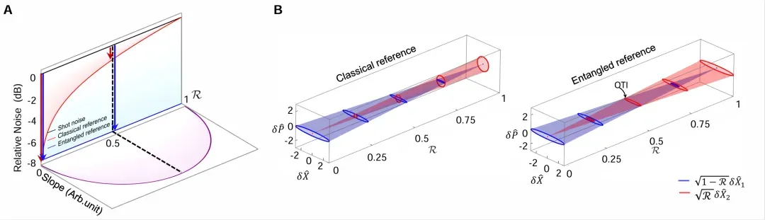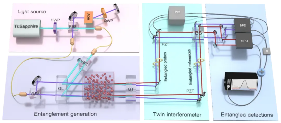 為突破此局限,團(tuán)隊(duì)構(gòu)建了互為糾纏的“量子孿生干涉儀”,取代現(xiàn)有的平衡零拍探測?;诓⑿信渲玫碾p對孿生糾纏光束,團(tuán)隊(duì)建立了量子關(guān)聯(lián)干涉與糾纏探測協(xié)同的相位測量新范式。這一成果成為量子計(jì)量學(xué)向前邁進(jìn)的又一里程碑。