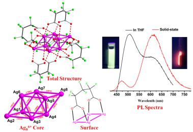 圖1全羧酸保護(hù)的具有罕見(jiàn)Ag8菱方體核心的超原子銀納米團(tuán)簇