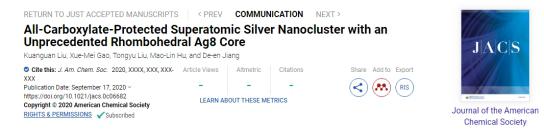 近日,寧夏大學(xué)寧夏光伏材料重點(diǎn)實(shí)驗(yàn)室劉寬冠副教授團(tuán)隊(duì)在銀納米團(tuán)簇化學(xué)研究領(lǐng)域取得重要科研進(jìn)展。劉寬冠以第一作者兼通訊作者在化學(xué)領(lǐng)域國(guó)際頂尖期刊《Journal of the American Chemical Society》(美國(guó)化學(xué)會(huì)志,以下簡(jiǎn)稱(chēng)JACS)上發(fā)表了題為“All-Carboxylate-Protected Superatomic Silver Nanocluster with an Unprecedented Rhombohedral Ag8 Core”的研究論文,寧夏大學(xué)為第一單位。