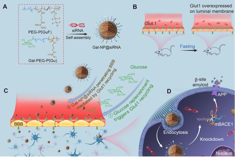 阿爾茨海默癥(俗稱老年癡呆癥)是一種常見的神經(jīng)退行性疾病,嚴(yán)重威脅著人類的健康。在阿爾茨海默癥中,β淀粉樣蛋白的積累被公認(rèn)為關(guān)鍵的致病因素之一,而β淀粉樣前體蛋白(APP)則由β分泌酶 1(BACE1)和γ-分泌酶水解而產(chǎn)生。小干擾RNA(siRNA)通過特異性沉默BACE1具有治療阿爾茨海默癥的良好前景,然而也面臨裸siRNA易被降解及代謝,以及由于血腦屏障(BBB)的阻礙,難以在腦部有效積累等一些挑戰(zhàn),缺少有效的遞送方法限制了siRNA的應(yīng)用。